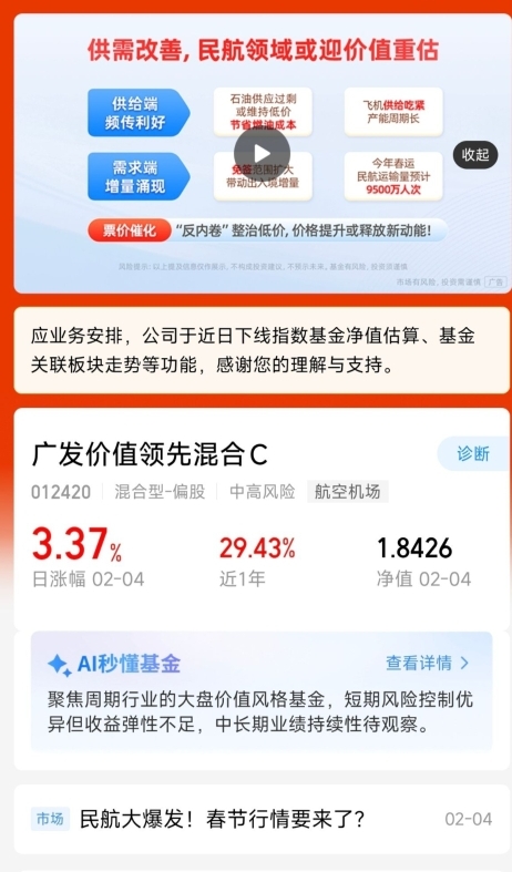 A股节前震荡不知道怎么布局?看民航就够了!广发价值领先混合C近一年涨29.43%