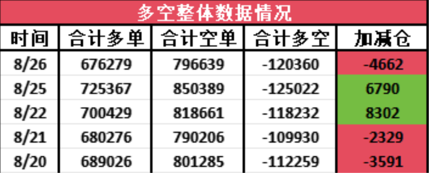 从各个期指各个月份的汇总数据来看,短期多头主力们减持多单49000多手,空头主力们减持空单53700多手,对冲之后空单净减少4600多手,对冲之后多空合计持有空单量减少到了120300多手,短期空头势力整体减弱,市场走好的概率增加。
