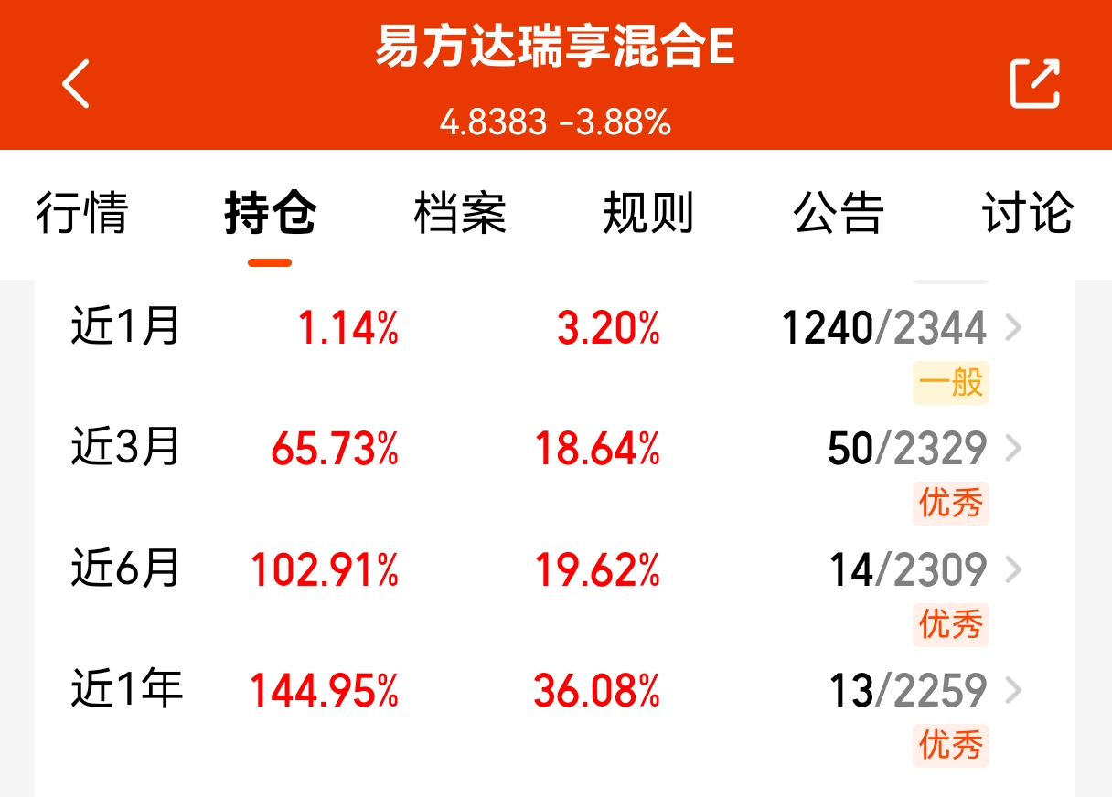 科技今年是真牛的,走势一直向上,今日又是上涨行情,每次拉都是拉科技,CPO行情今年涨了不少,$易方达瑞享混合E(OTCFUND|001438)$涨势喜人,今日又涨超2%,近三个月涨幅65.73%,近六个月涨幅102.91%,近一年涨幅144.95%,经理能力真好,这一波行情踏得跟准,过往调仓很坚定、效果很好。