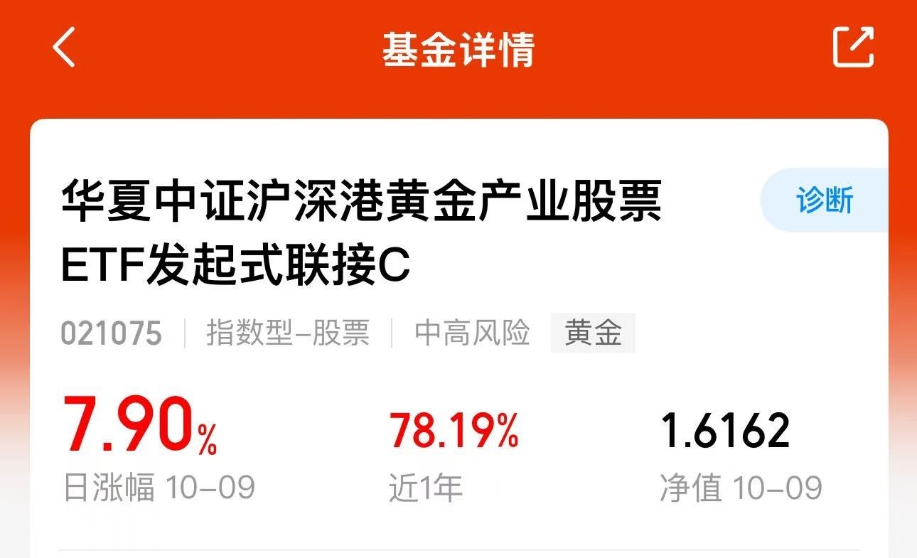 在法币贬值+地缘分裂大趋势背景下,金价有望长牛,近3月43%+,近6月70%+,昨天又增收7.9%的收益真是实打实的牛,$华夏中证沪深港黄金产业股票ETF发起式联接C$增收强