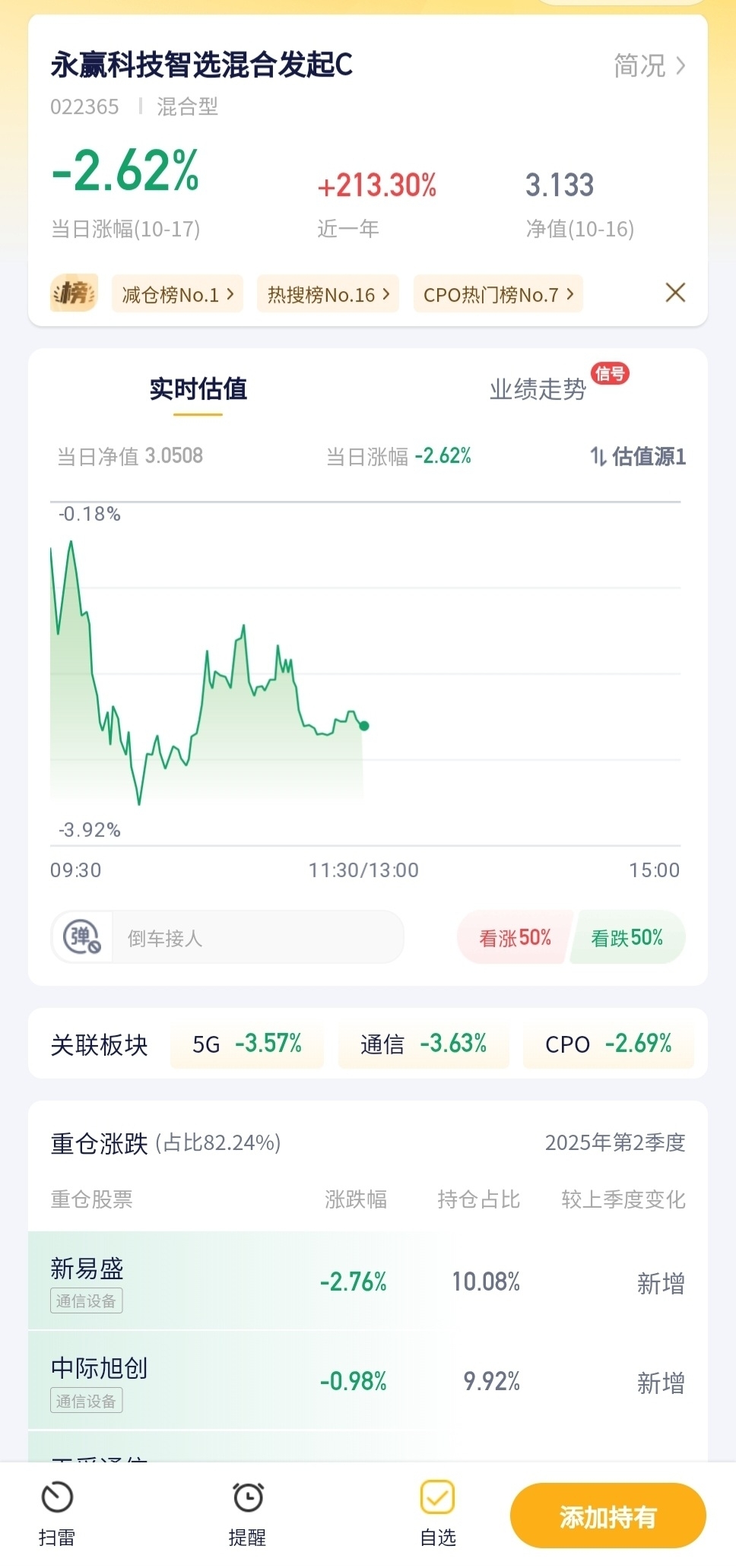 永赢科技智选混合发起C今日预估跌幅2.62%!