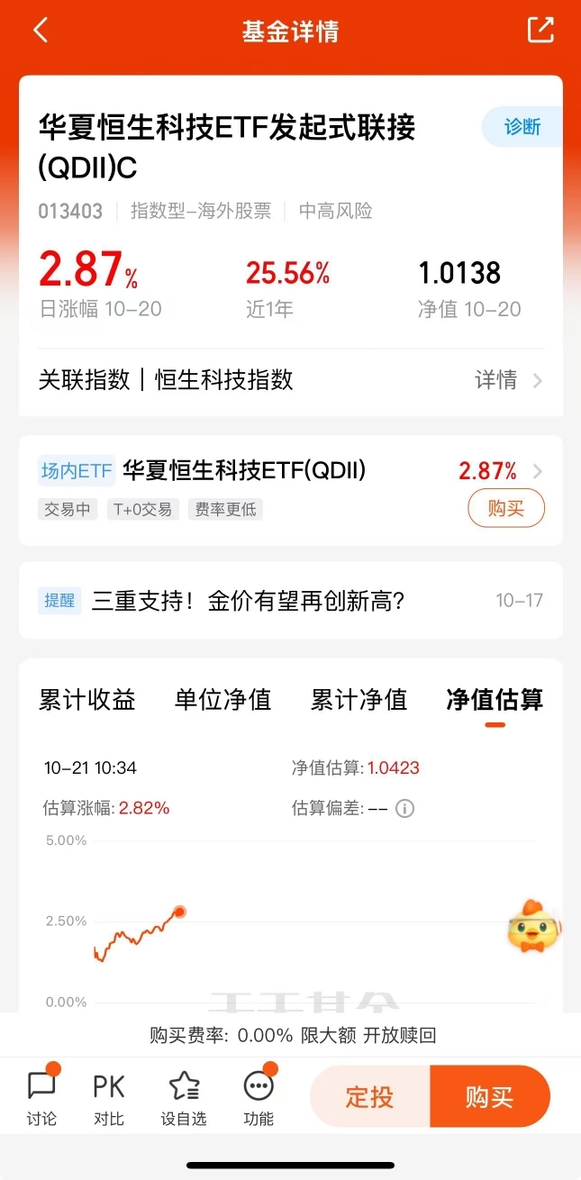恒生科技继续反弹,开盘即涨,当前上涨2%+,近1年收益25.56%,$华夏恒生科技ETF发起式联接(QDII)C$估值不高,计划年前都持有