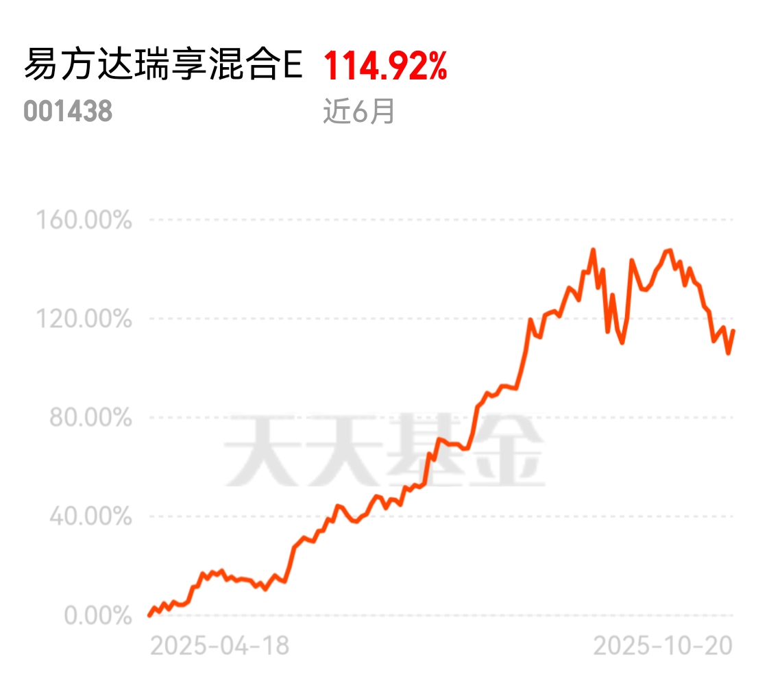 今天又是开心吃肉的一天,看来不能一味的看空,继续入手易方达瑞享混合E 这只基不错,近6个月涨幅达114.92%,成立以来涨幅超400%,震荡行情下爆发力也强,看来基金经理的个人能力非常强,长期表现优异,其代表作瑞享混合成立以来的业绩+381%,过往调仓很坚定、效果很不错,相信经理的全市场配置,安心看长期。