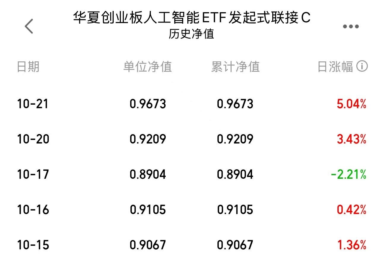 成立一个月的$华夏创业板人工智能ETF发起式联接C$上涨动能还是很强劲的,今天收益5%+,昨天收益3%+,持仓还有新易盛、中际旭创等大佬,反弹来了