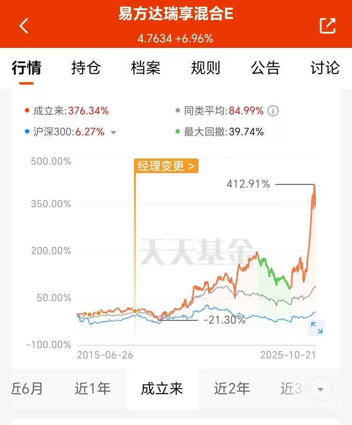 建仓时没多想,就觉得科技赛道有潜力,随手入了$易方达瑞享混合E(OTCFUND|001438)$,后来遇到市场震荡,它没跟着乱跌,比身边人买的同类基金稳不少,这才安了心。直到CPO行情来,它突然发力,再看收益,从成立到现在已经涨了 376.34%。本来只是试试,现在看着这条业绩曲线,长期持有的决心更坚定了。