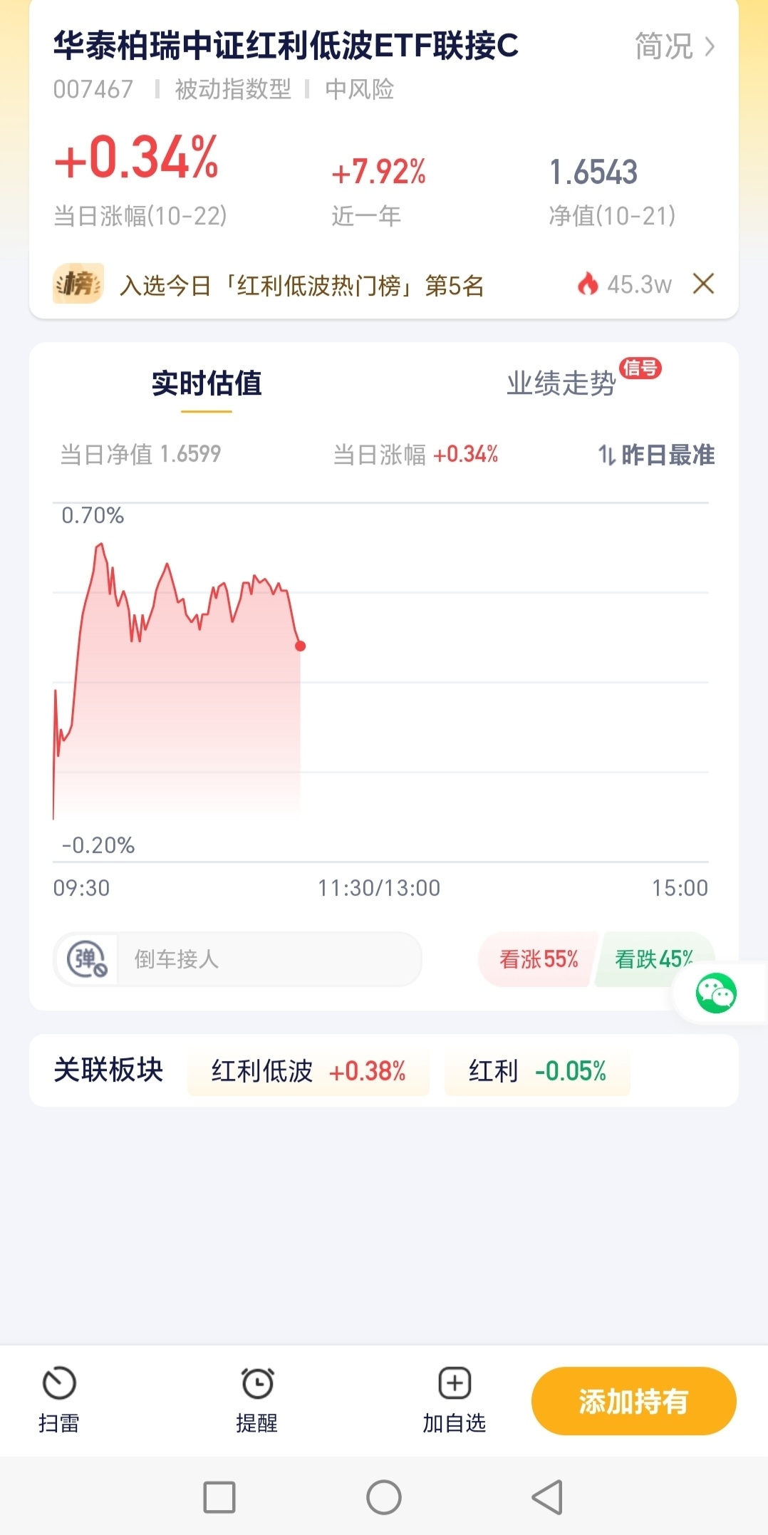今天好多板块都跌了,科技、黄金也没逃过,唯独红利低波板块硬气,涨了0.38%!咱们华泰柏瑞今日也涨了0.34%,近一年收益7.92%。这基跟着红利低波板块走,还月月分红,现在入手性价比不错,追求稳一点的可以关注下!$华泰柏瑞中证红利低波ETF联接C$ #黄金创12年来最大单日跌幅!什么信号#