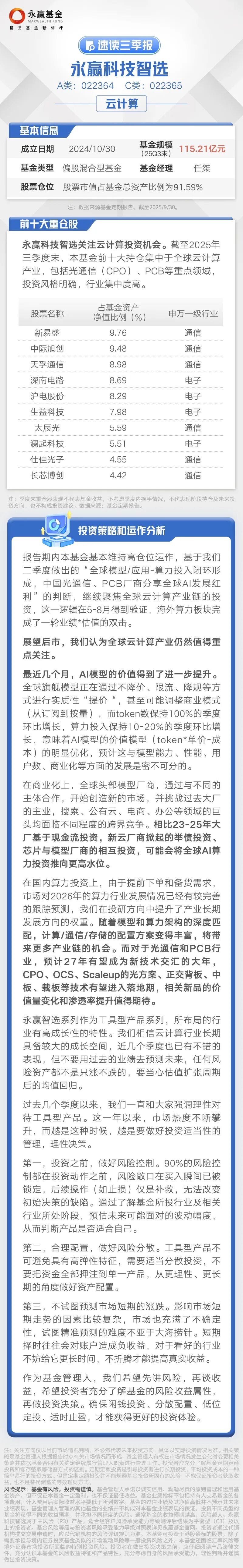 永赢科技智选关注云计算投资机会。截至2025年三季度末,本基金前十大持仓集中于全球云计算产业,包括光通信(CPO)、PCB等重点领域,投资风格鲜明,行业集中度高。