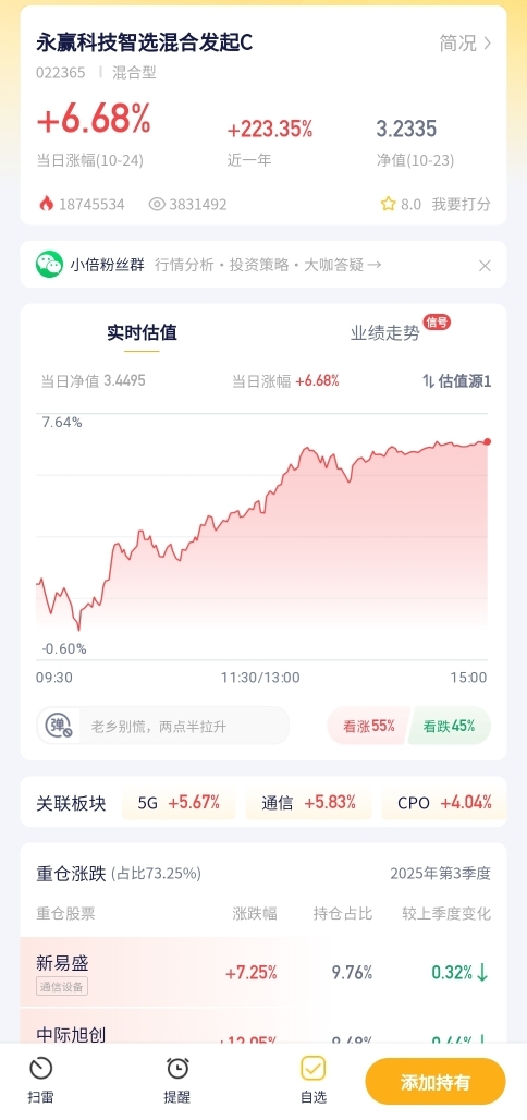 今天科技股支棱起来了,永赢这科技基金跟着猛涨,6个多点的涨幅,在科技赛道里表现亮眼,持有的小伙伴今儿收益不错哟。