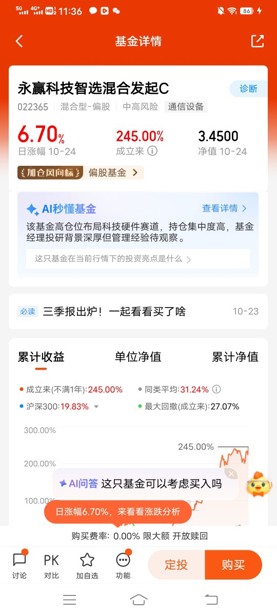 科技持续发力,市场情绪火热,科技基金更是牛的不行。$永赢科技智选混合发起C$周五
