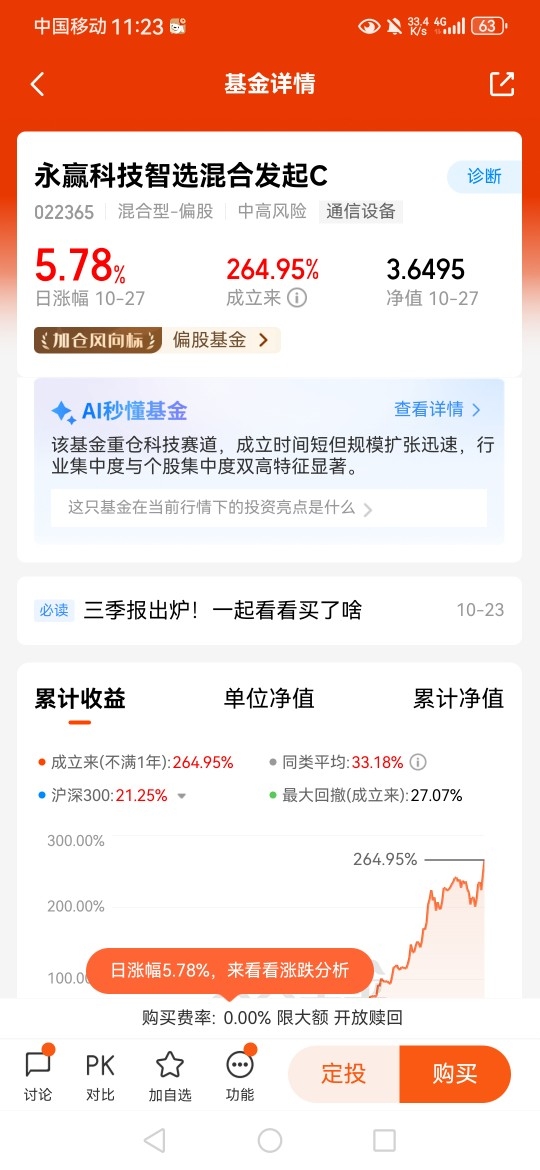 $永赢科技智选混合发起C$ 昨日上涨5.78%,前面曾一度实现连续上涨,成立以来累计涨幅达264.95%。基金近期的强势表现与其重仓的算力、通信设备、光通信等板块的利好共振有关,四季度各类政策利好助推,投资布局顺势而为就好,你们觉得呢?#科技热点摊开业啦#