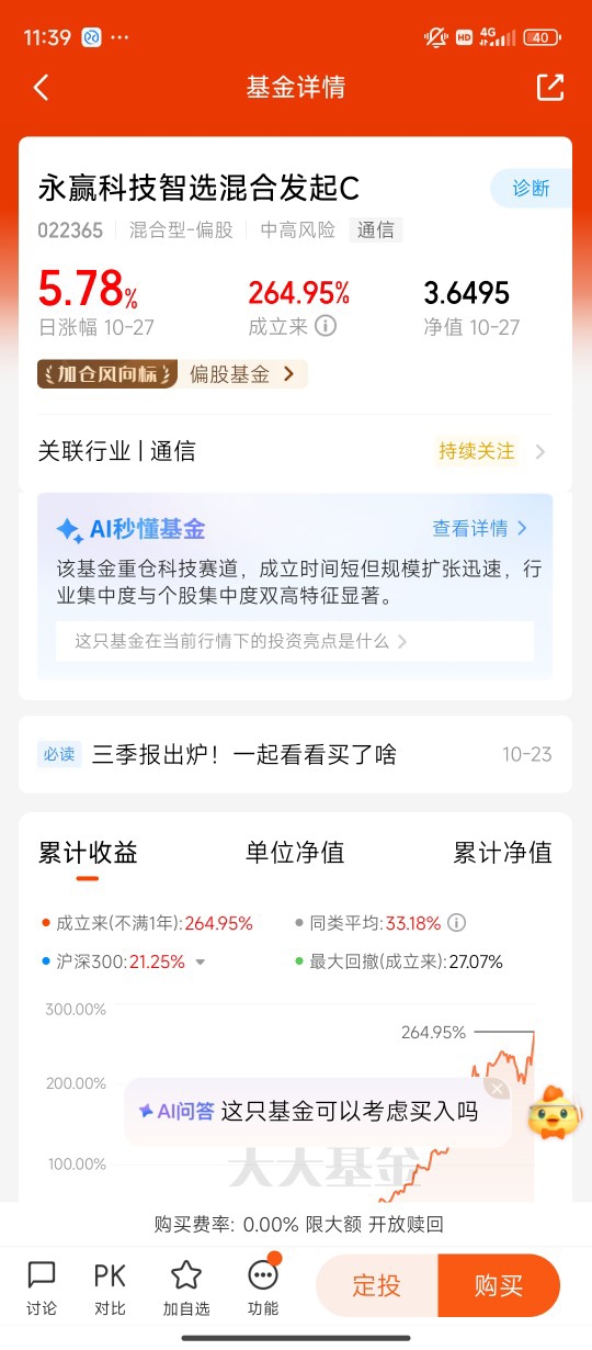 近半年增幅同类排名前二的$永赢科技智选混合发起C$昨晚暴涨5.78%。一周涨幅1