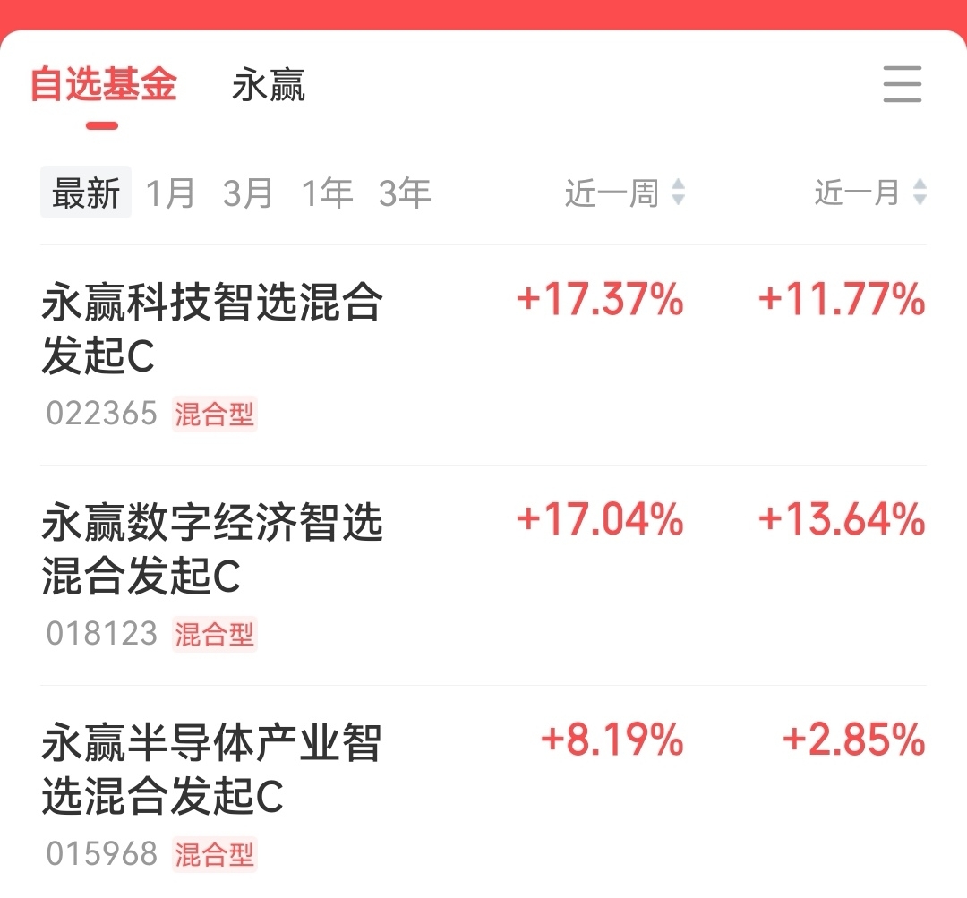科技赛道是未来一大经济发展方向,其行情远没有结束呐;一起来看看永赢系列的最新表现吧,$永赢科技智选混合发起C$ 近一周涨幅+17.37%,近一个月涨幅+11.77%;$永赢数字经济智选混合发起C$ 近一周涨幅+17.04%,近一个月涨幅+13.64%;$永赢半导体产业智选混合发起C$ 近一周涨幅+8.19%,近一个月涨幅+2.85%;现在开始着手布局明年行情也是不错的呀,嘿嘿#A股盘中突破4000点!下个目标位在哪?#