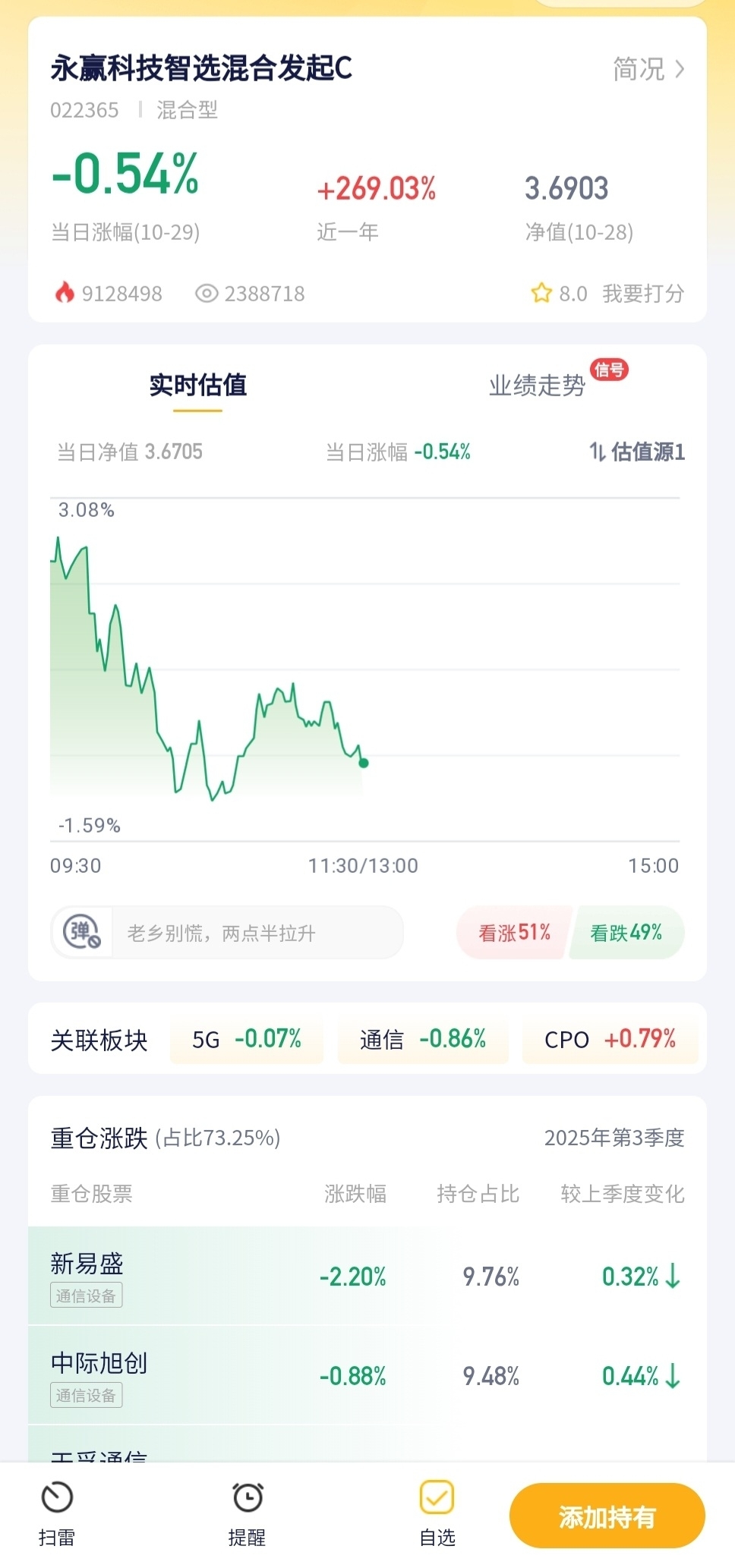永赢科技智选混合发起C今日预估跌幅-0.54%!