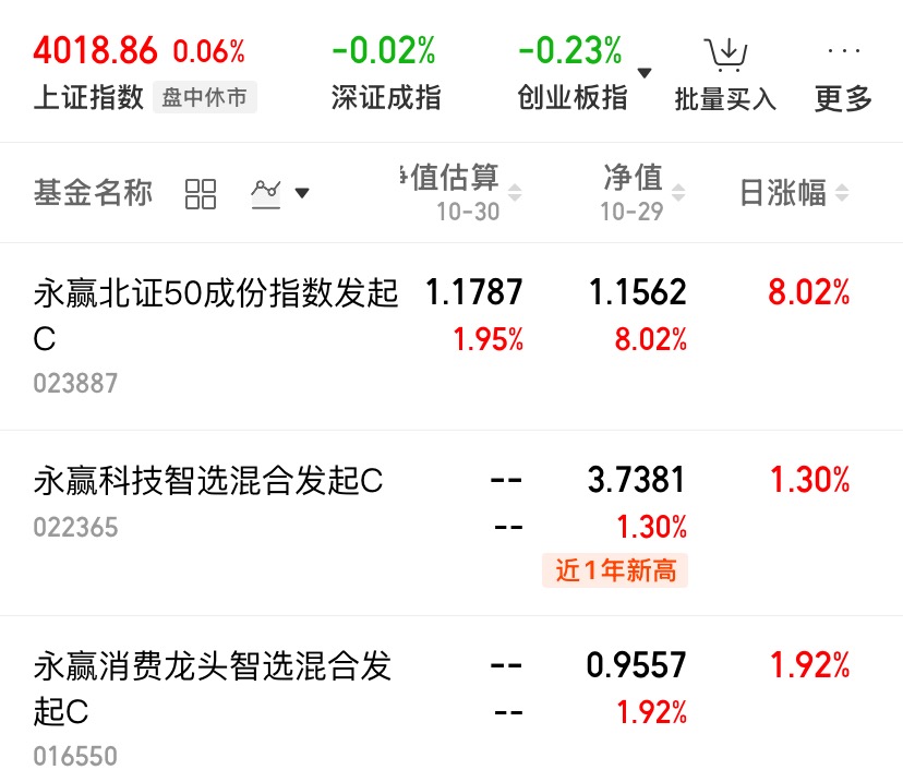 $永赢北证50成份指数发起C$ :聚焦北交所“专精特新”中小企业,昨天暴涨8.02%,近六个月收益17.73%;