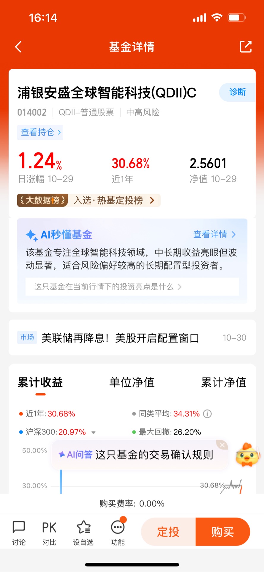 浦银安盛全球智能科技重仓美股科技龙头,海外AI产业链一条龙都覆盖了,看的准弹性高,美股科技可以长期投资,