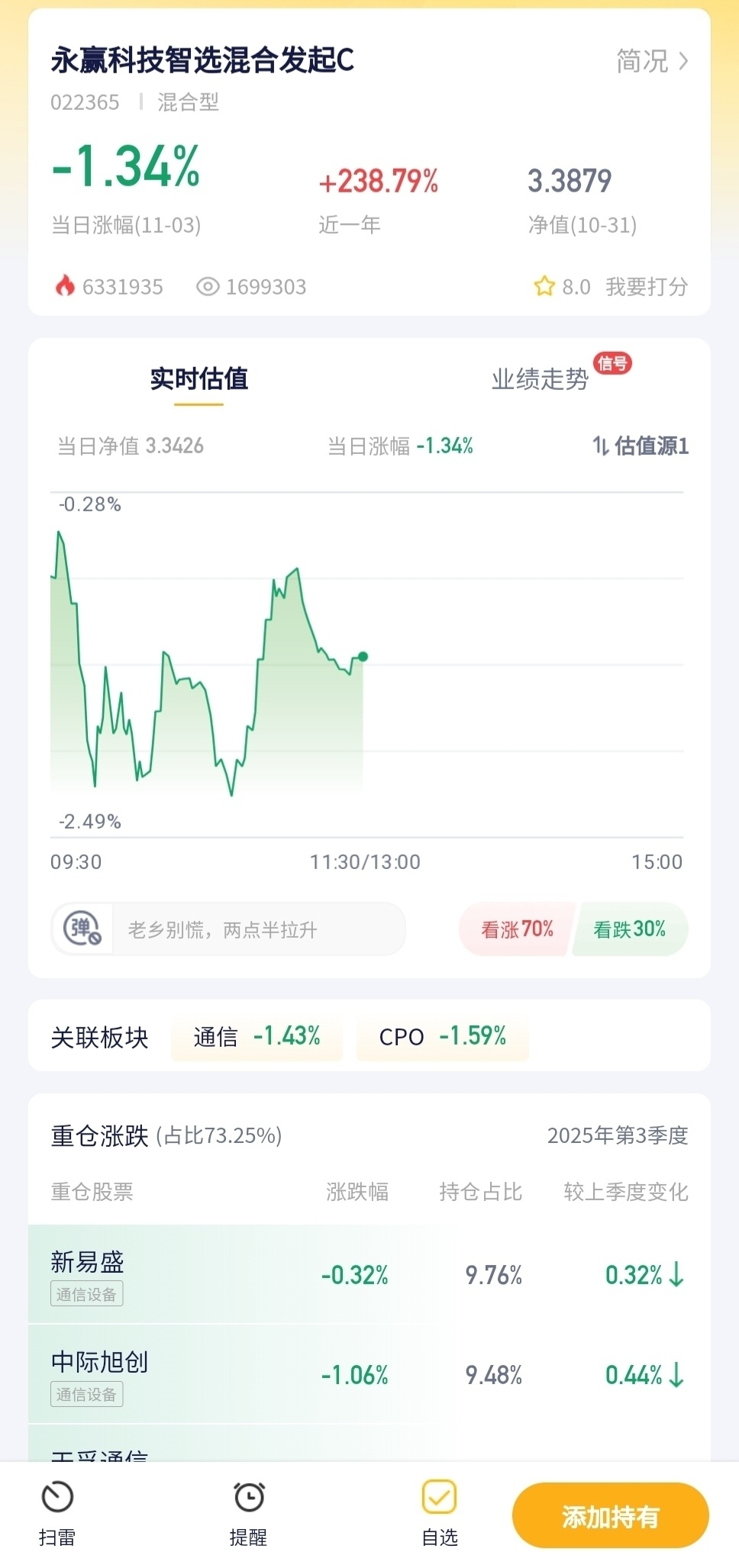 永赢科技智选混合发起C今日预估跌幅-1.34%!