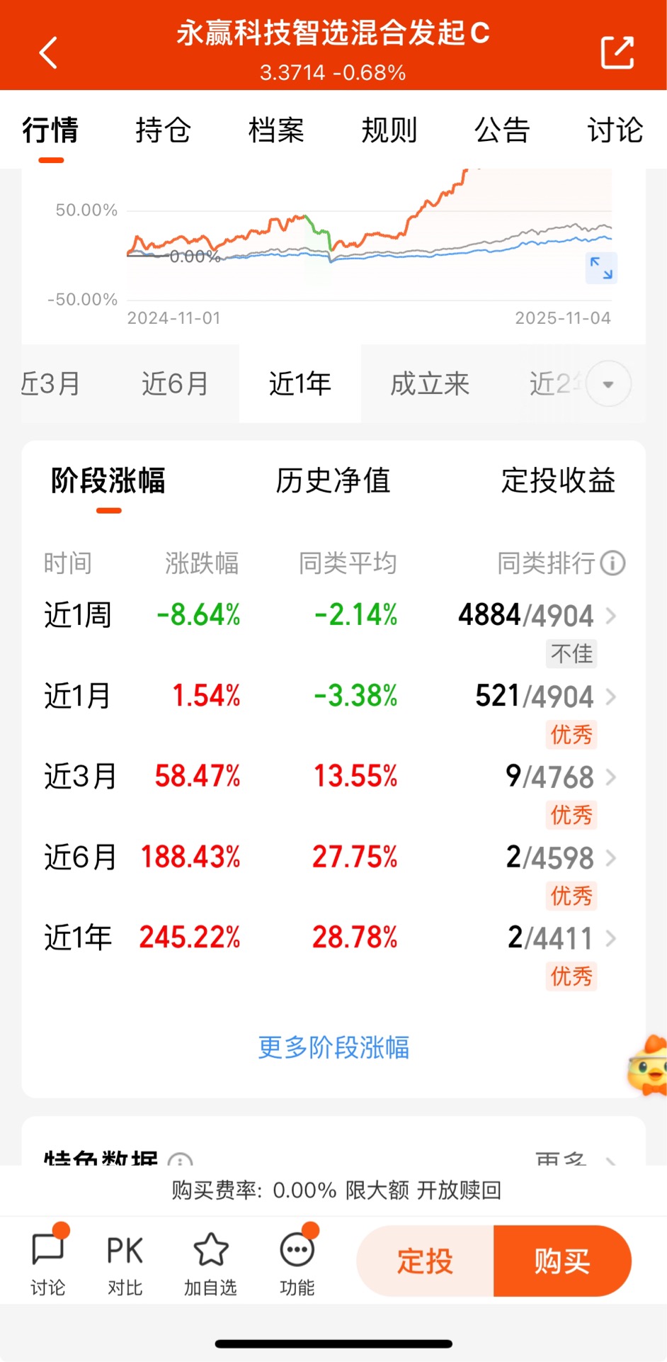$永赢科技智选混合发起C$ 这个行情需要耐心等待一下,近一个月收1.54%,近3个月收58.47%,近6个月收188.43%,近1年收245.22%,表现优秀,同类排名第2哈。作为专精于CPO概念投资的利器,以同类第一的业绩表现,成为捕捉光模块概念的场外首选基金。在10月市场回调中,其通过增持通富微电(CPO封装突破)、减持短期涨幅过大的标的,成功实现净值逆势创新高。