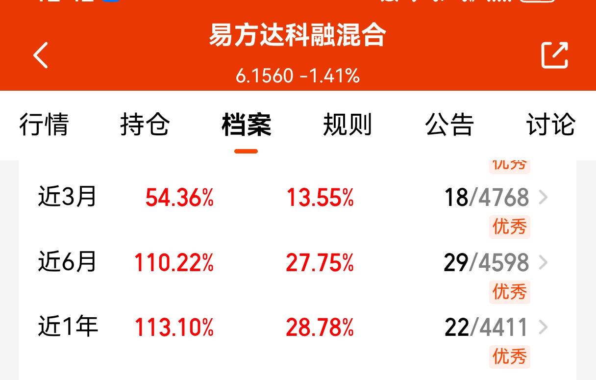 投资还是全面一些为好,鸡蛋不要全放一个篮子里面,成长行情轮动快,易方达科融混合深度参与科技、新能源、军工轮动配置,夏普比率优秀,是成长里的均衡之选,整体来看业绩也很优秀,这比于押注单一科技赛道好很多,近期回撤风险高,这种混合的风险小一些。