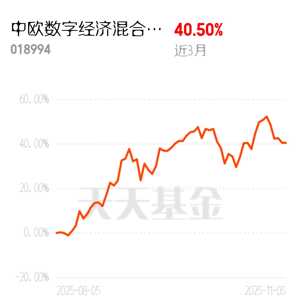 科技赛道现在是大家公认的香饽饽,政策支持加上需求爆发,想不火都难。我一直拿着中欧数字经济混合C,它把数字经济产业链上下游都布局到了,特别全面。近3个月涨了40.50%,涨得快还稳,跟着它投资,就能轻松抓住科技牛市的机会!