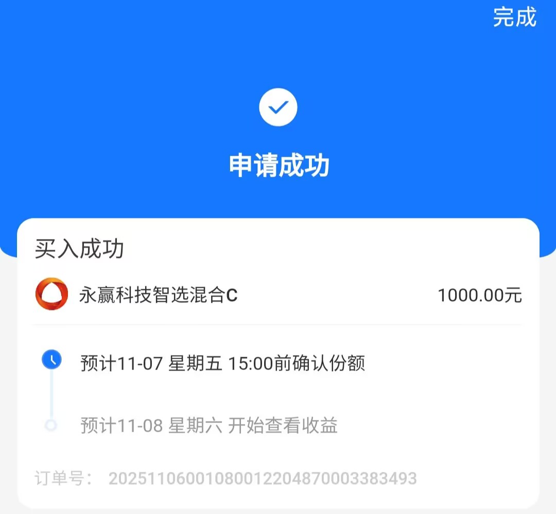 今日买入1000元$永赢科技智选混合发起C(OTCFUND|022365)$,该基金多季度重仓CPO个股,今年以来科技主线十分明显,而CPO又是主线种的主线,该基金弹性比较大,牛市涨得快,今年以来该基金累计涨幅高达196.5%,其A类年收益198%,长期排名年度收益第一,我之前已经持续布局,也收获了不少。经过10月份的反复震荡修复后这两天股市又开始拉升,今天上证指数重返4000点,感觉新一轮行情即将开启,A股牛市继续,牛市就买科技,咱就稳定加仓就完事了,今天决定继续追加1000元增大仓位。
