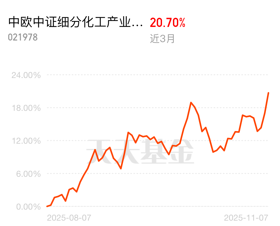 科技板块轮动快得让人跟不上,刚买入就调整,化工却靠涨价和需求两大逻辑涨得扎实。估值位置也舒服,中欧中证细分化工产业主题指数C近3个月涨20.70%,覆盖热门细分赛道,拿住它,投资不用瞎操心。