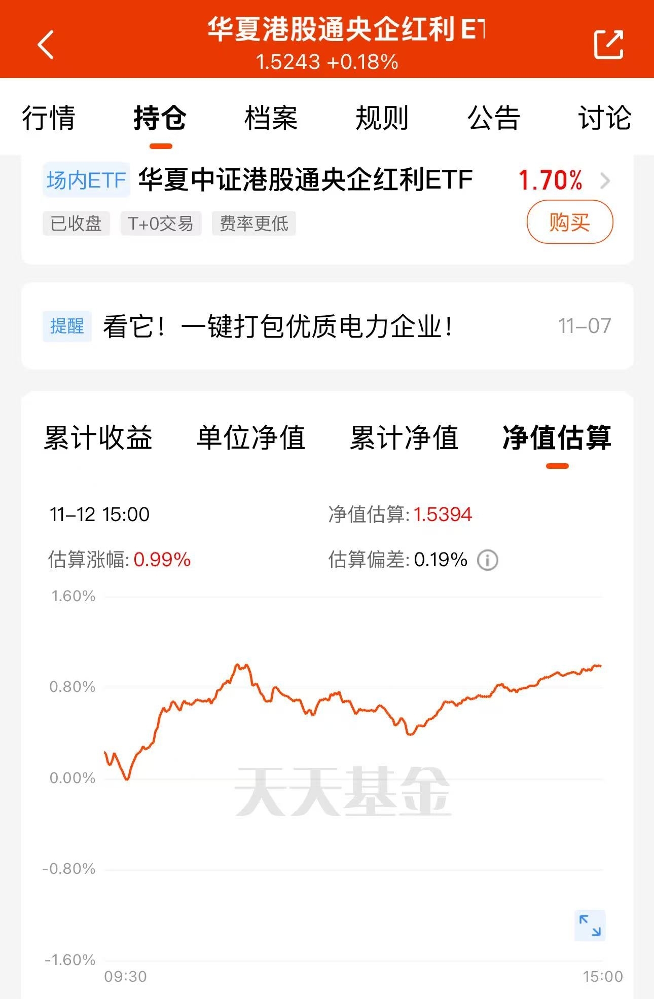 市场震荡依旧,为了年底红包丰厚,选择拿点红利性产品,这基连红5天,今天也是正收益的一天,$华夏港股通央企红利ETF联接C$股息也高,持仓也都是央企,体验感不错