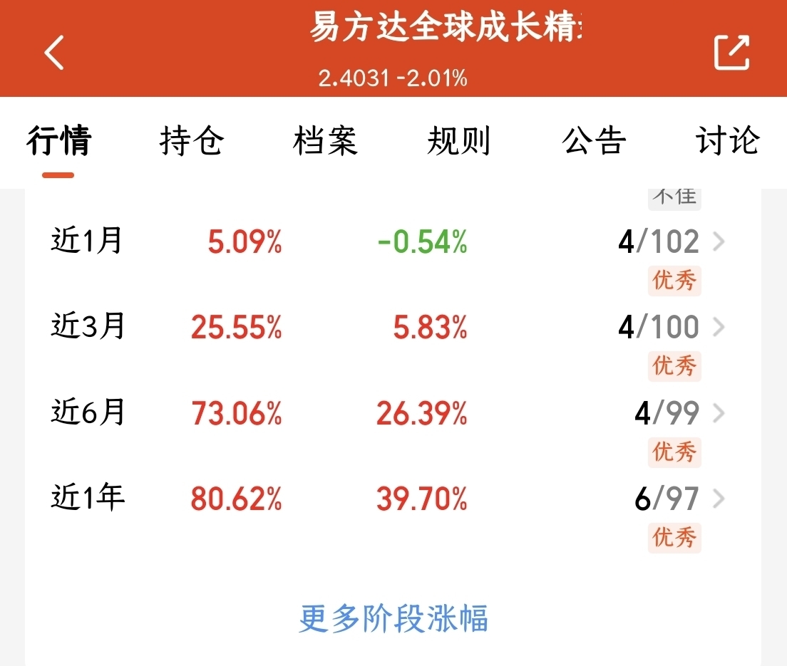 大盘今天又震荡调整了,行情太不稳定了,还是要布局一些抗回撤能力强的基啊。$易方达全球成长精选混合(QDII)人民币C$ 产品稀缺且投资策略灵活,可在A、H、美股间切换以规避风险并抓科技机遇。基金经理业绩稳健,公开季报显示其敏锐布局,精准预判市场趋势,调仓灵活且胜率高。科技行情长期向好,近期回调是上车良机。