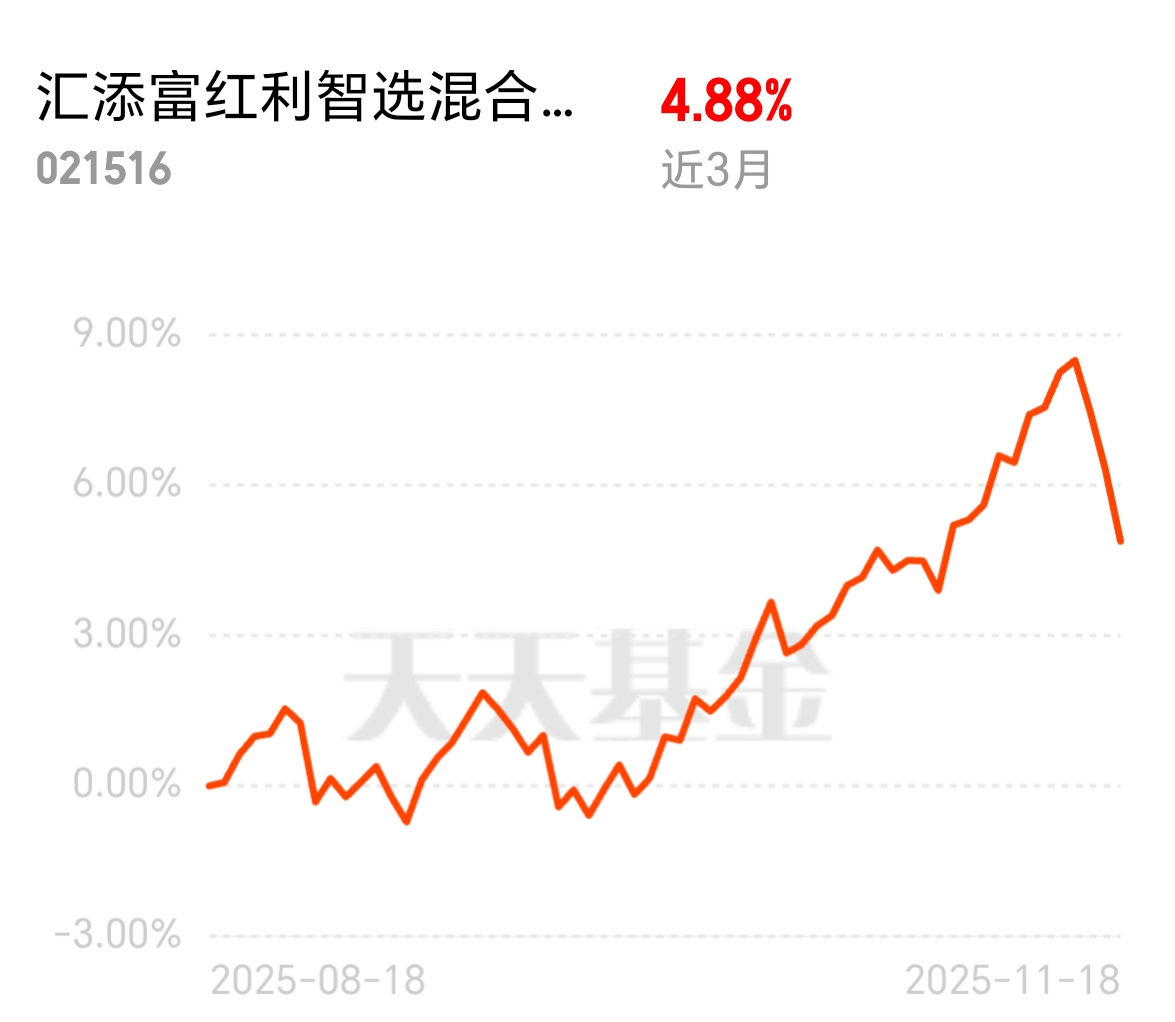 市场上热门板块拥挤,反而红利这类低波动资产更吃香,汇添富红利智选混合C近3个月涨4.88%。三季报明确配了有色和银行,都是高股息赛道,今天估值也涨了,跟着实盘拿住,不用折腾就能享收益。