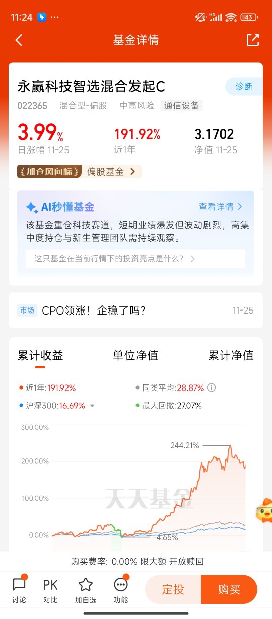 科技最强赛道非CPO莫属!$永赢科技智选混合发起C$昨晚暴涨3.99%。近半年涨