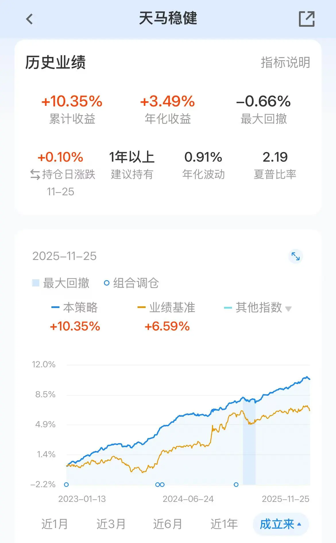 天马稳健组合的累计收益是10.35%(图1);