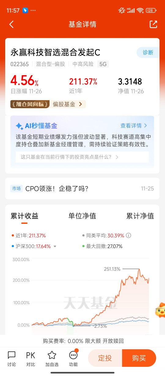 #今年你的投资目标达成了吗?# 选对赛道进对门很重要。$永赢科技智选混合发起C$ 昨晚暴涨4.56%。连涨两天共收8.55%的涨幅。近半年179.24%,近一年涨幅达到211.37%。同类排名前二,被业绩惊艳到了!超高弹性赛道,非CPO板块莫属。CPO行情涨势很强。看好算力硬件的,可以重点关注起来。