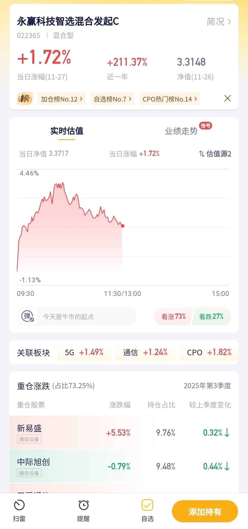永赢科技智选混合发起C今日预估涨幅+1.72%!