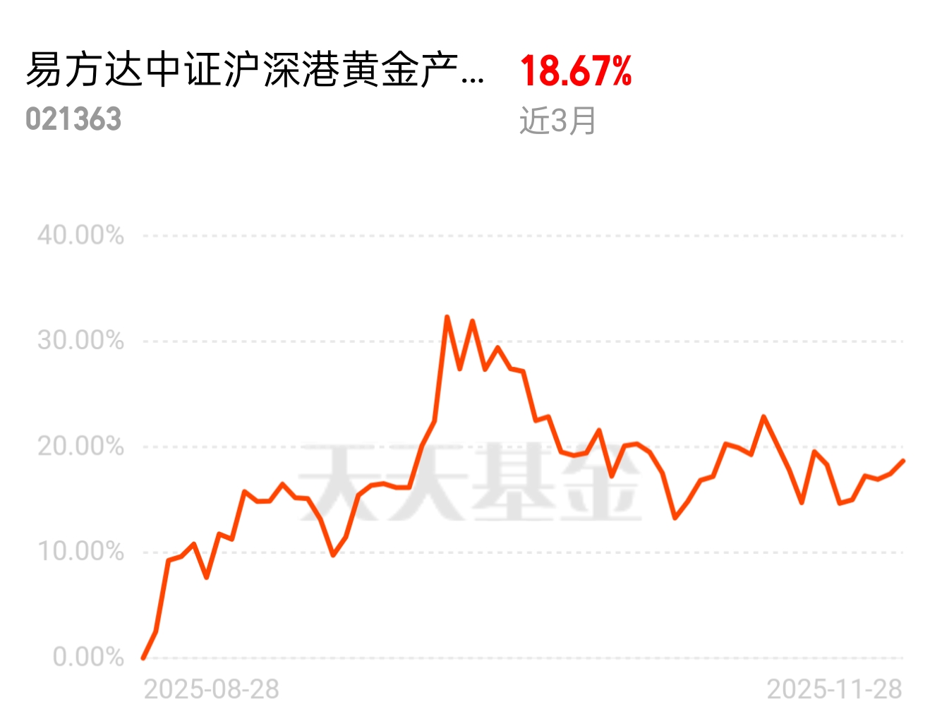 通胀压力仍在,实际利率下行,黄金保值增值属性凸显,黄金股比实物黄金弹性更足。易方达中证沪深港黄金产业股票指数 C 近 3 个月收益 18.67%,精准捕捉板块机会,涨得猛还灵活,持有超省心。