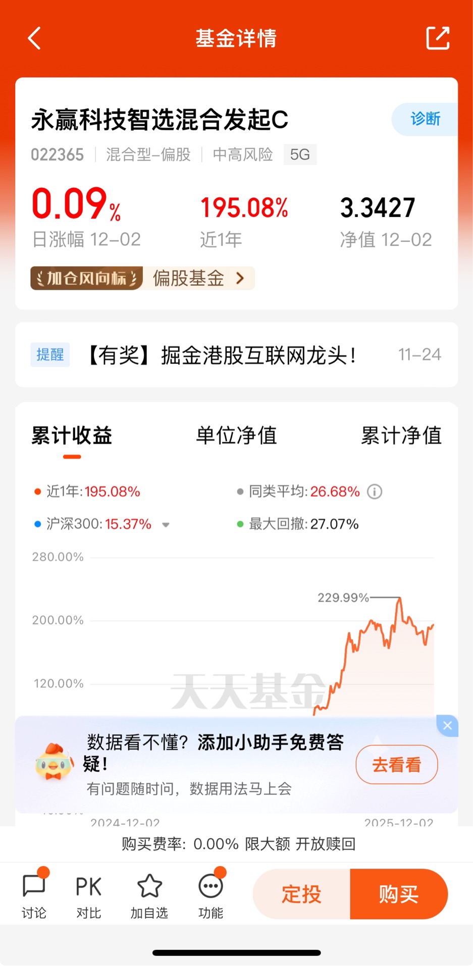 $永赢科技智选混合发起C$ 昨天收0.09%,近一周收5.44%,近6个月收175.37%,近一年收195.08,同类排名第2,表现优秀!CPO概念,聚焦科技赛道,主投CPO海外产业链,CPO产业链从跟跑到并跑,趁着波动继续布局,超高弹性。紧扣科技产业升级的核心逻辑,既关注企业的长期技术,在追求高弹性的同时,基金通过严格的风险控制,将最大回撤控制到最低,展现出“攻守兼备”的特质。