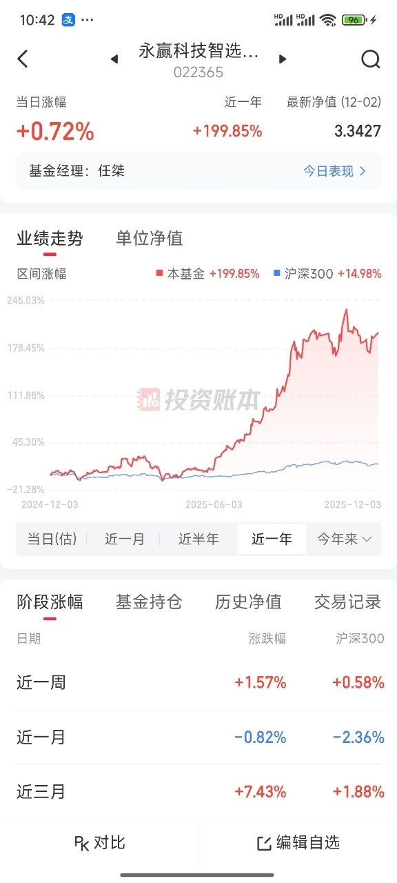 捉到一只本年度冠军基,永赢科技智选C022365,今天估值又涨0.72%,近一年收益率195.08%,涨幅第一,这只各个阶段都有明显的超额收益,第二名跟永赢科技智选还有50多个点的收益,毫无疑问,本年度冠军就是你了。