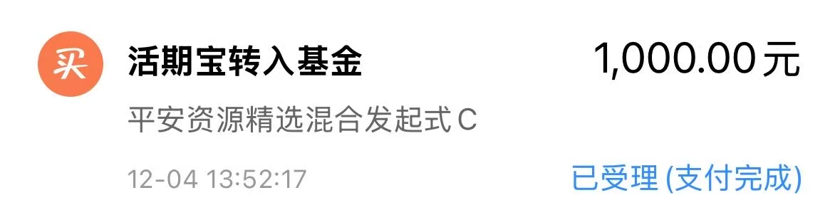 今天我继续加仓平$平安资源精选混合发起式C(OTCFUND|025651)$ 1000元