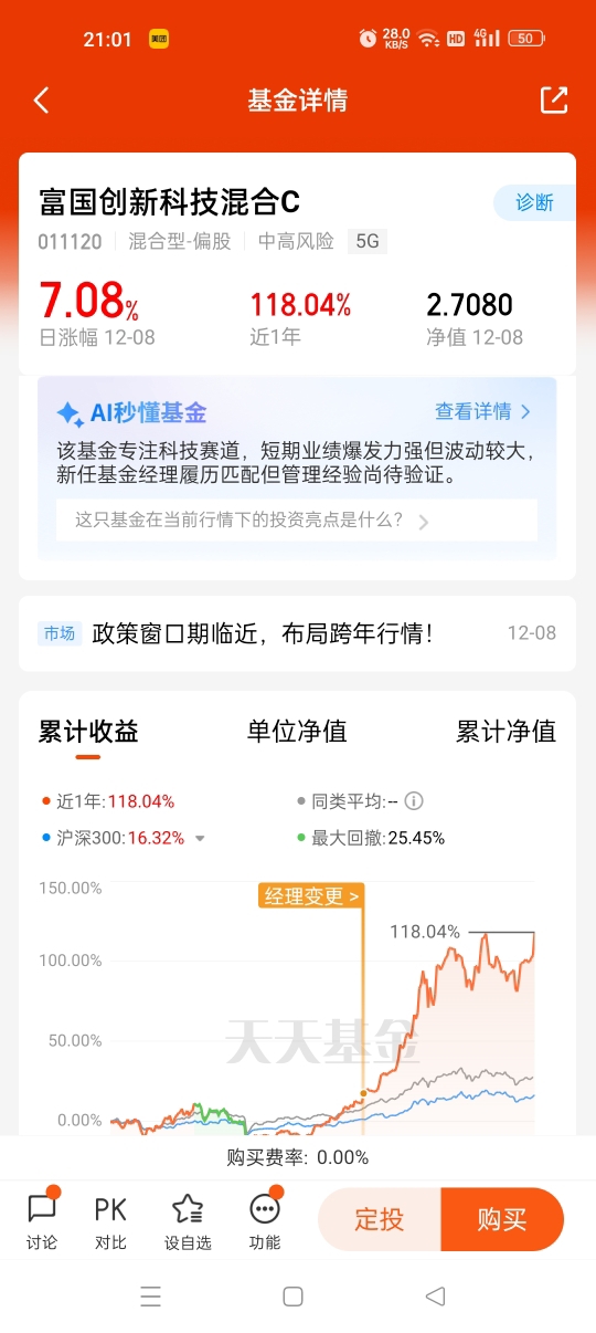 最近科技类板块表现强劲,值得配置$富国创新科技混合C$今天收了7.08%,$汇添