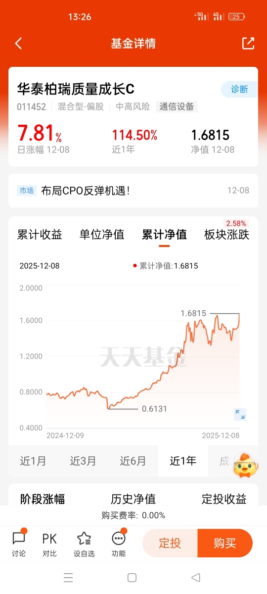 聊点实在的,最近CPO板块的行情不用多说吧?弹性高就是它的最大特点,回调从来都是短期的,涨起来却又猛又快。华泰柏瑞基金就精准押中了这个方向,昨天单日涨幅直接干到7.81%,看得人眼热!能跟上CPO的节奏,又有实打实的涨幅支撑,比起瞎选的基金,这种踩中主线的真的省心多了。$华泰柏瑞质量成长C$ #券商行业迎利好:杠杆上限“松绑”#