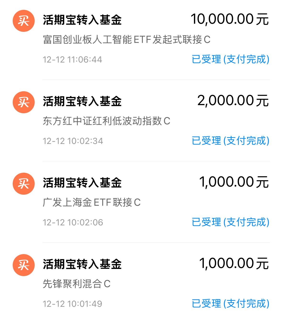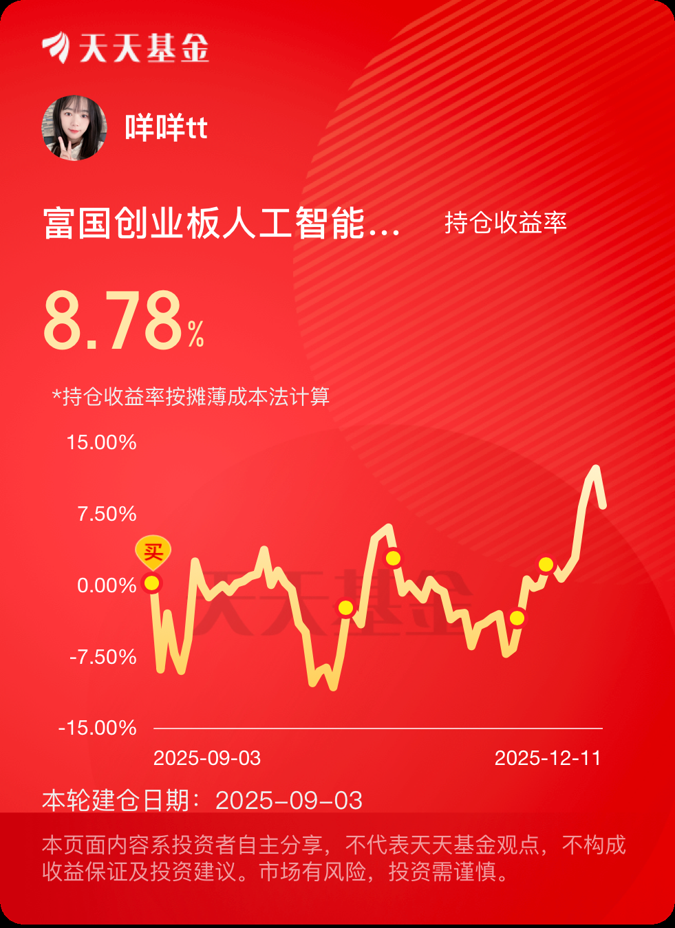 我持有的富国创业板人工智能指数买少了,是真的买少了,就只投了5000,即便是追涨买的也已经赚了8个多点的收益,实在是等不到低吸机会,我今天干脆大额追加1万进来,先把仓位给提升了再说。