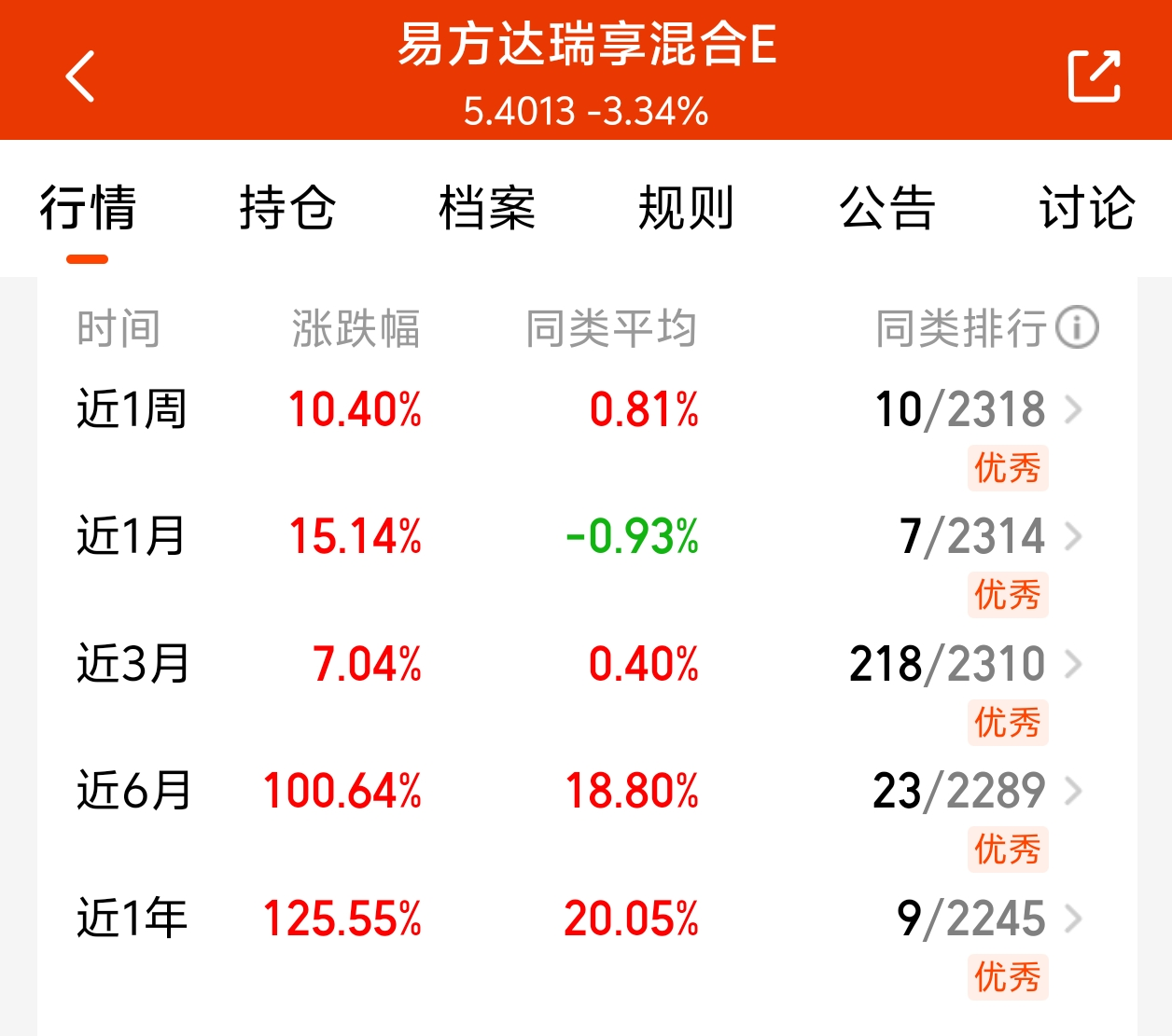 市场行情企稳回暖,今天走势强劲!CPO又是市场最靓的仔,连续吃肉真是赢麻了$易方达瑞享混合E$ 易方达瑞享混合近六个月涨幅100.64%,走出了翻倍行情,太优秀了!经理全市场配置,择时调仓,其业绩真是没得说,跟上经理,干就完了