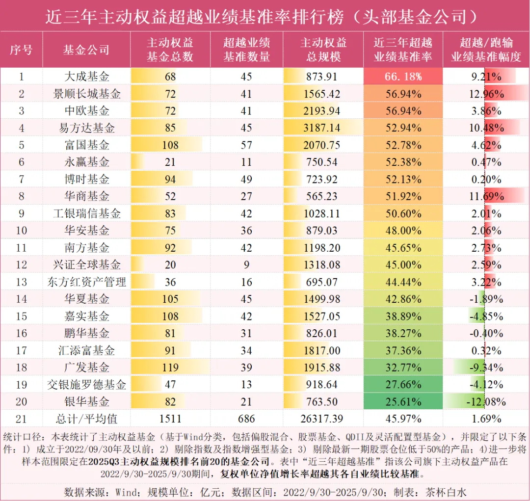 从业绩基准超越率来看,笔者统计了20家头部基金公司在近三年(2022/9/30-2025/9/30)的表现:大成基金以66.18%的超越率位居第一,意味着其旗下近七成产品跑赢了各自的业绩比较基准,远超行业平均水平(45.97%)。