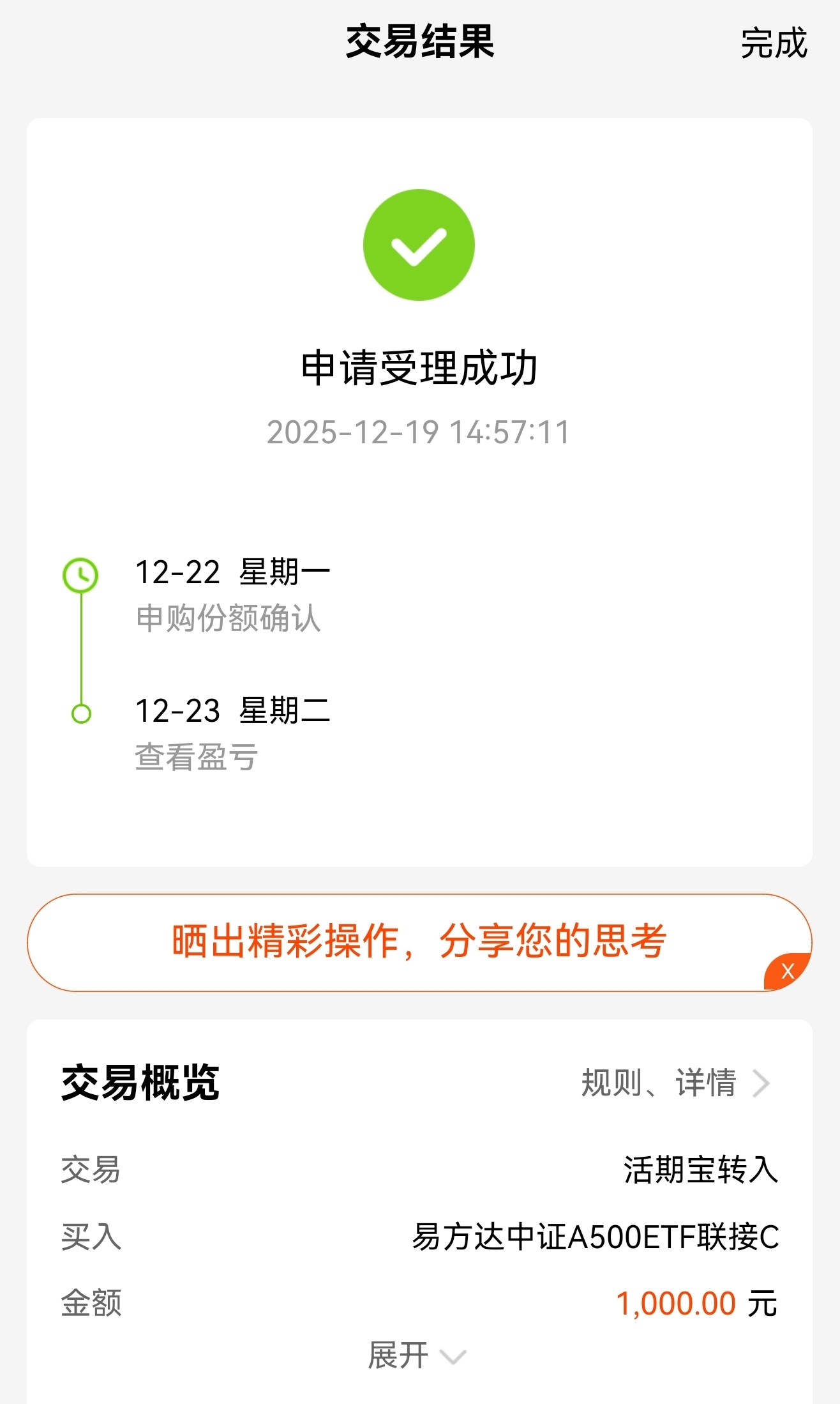 大盘高开高走续涨!果然昨天只是蓄力~板块轮动太快抓不住,宽基才是省心之选!易方达中证A500ETF联接C太香了,自带核心+成长哑铃策略,攻守兼备!近一年涨19.85%,上市一年吸引150+险资账户,2045亿+资金底舱加持,长期机构都在蹲,果断加仓!