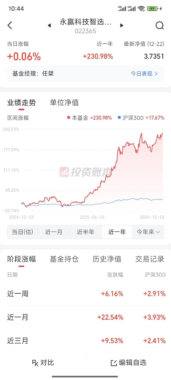 捉到一只本年度冠军基,永赢科技智选C022365,昨天净值大涨3.93%,今天估值又涨0.06.%,近一年收益220.55%,涨幅第一,这只各个阶段都有明显的超额收益,毫无疑问,本年度冠军就是你了。