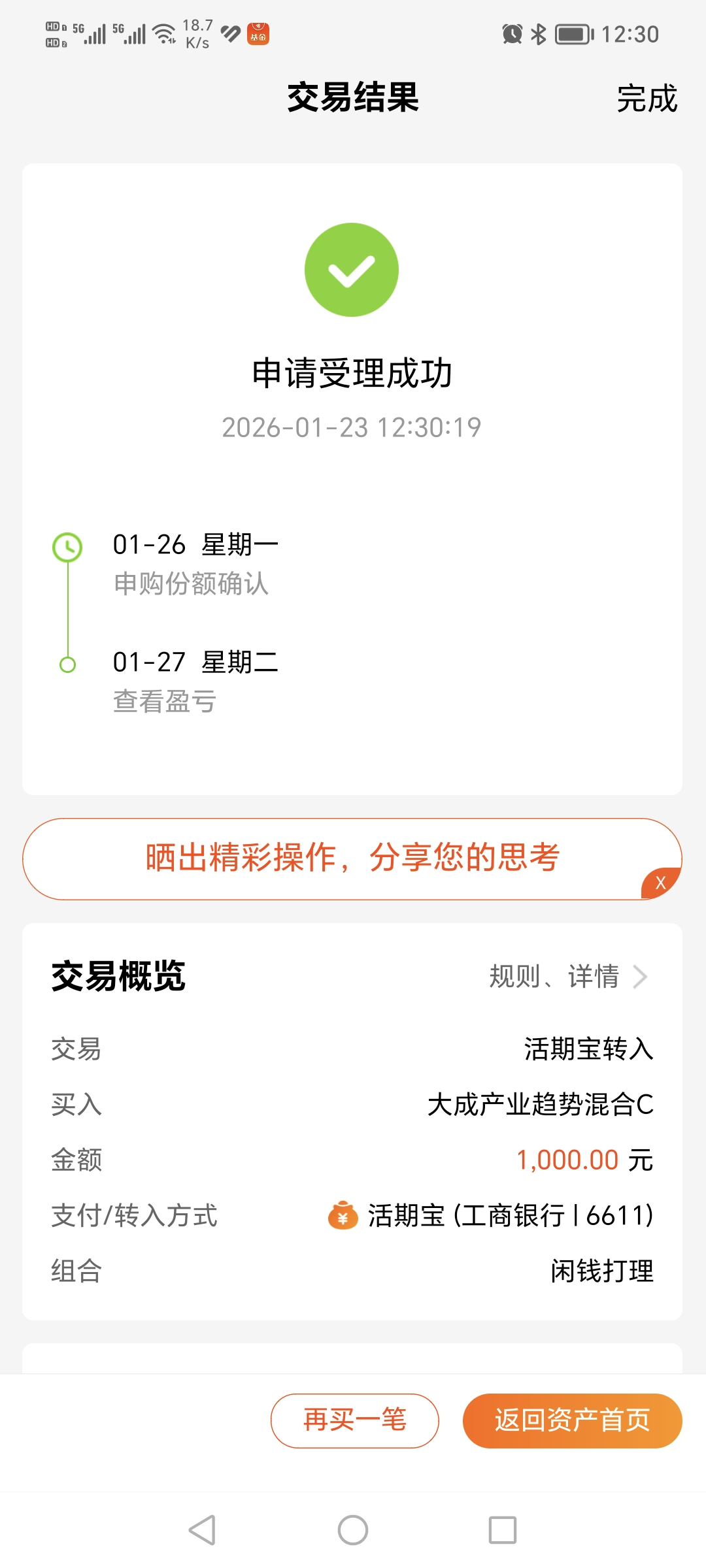 $大成产业趋势混合C(OTCFUND|010827)$今天加仓1000元。