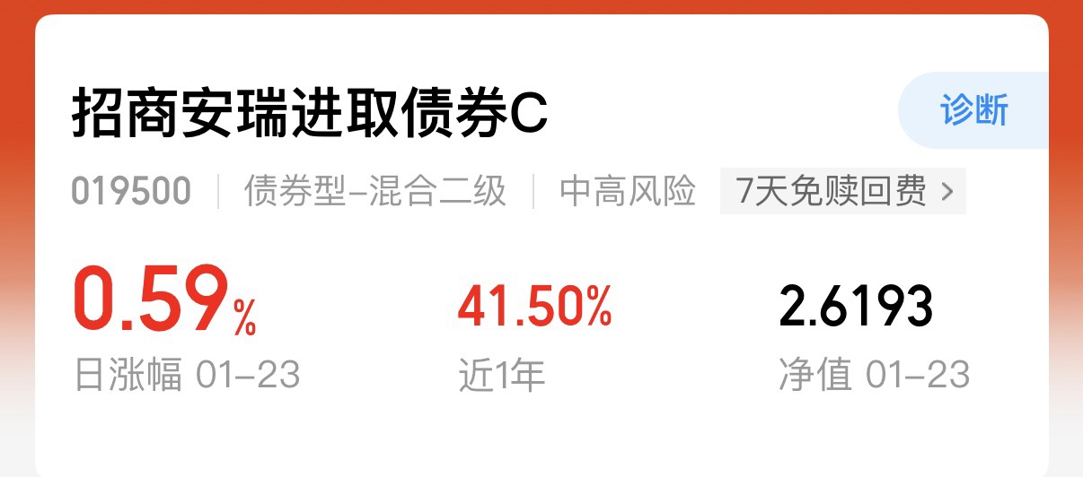 最近债券市场的行情还不错,可转债市场也是很热闹,利率债和信债,近期一直在走强,像固收类的基金这周都有比较好的收益,$招商安瑞进取债券C$ 这周净值上涨3.01%,比同类要稍微好一点,而且它的底子较稳,弹性在这种震荡的市场里也更足一点,我打算继续持有了