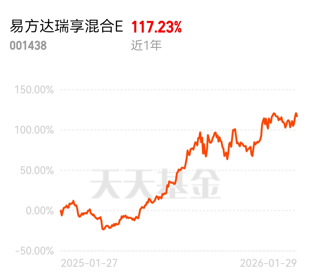 我还是看好这支$易方达瑞享混合E$ ,CPO龙头为主,资金抱团明显,涨起来也快,弹性十足,近1年收益117.23%%了,已经很快翻倍,积累了不错的赚钱效应,而且,前期炒作热度较高的AI应用等题材出现回调,资金向CPO等强势板块集中的态势愈发清晰,我就看长期行情啦!