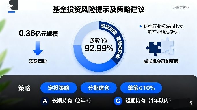 当然,投资需理性看待潜在风险。该基金股票仓位较高(约92.99%),因此受股市波动影响较大。同时,基金规模较小(约0.36亿元),存在清盘风险。此外,持仓集中于传统行业,对新兴产业覆盖不足,可能错过部分成长机会。