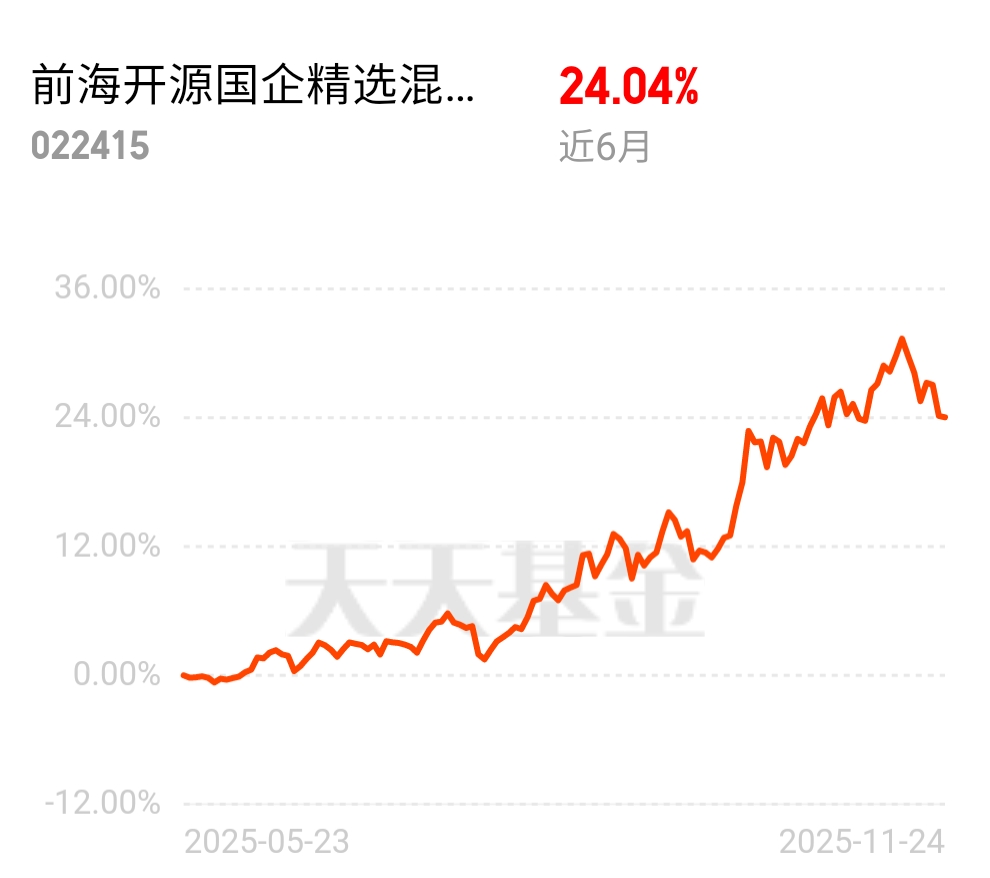 综上所述,国企不仅财务稳健,分红给力,而且在转型升级、国企改革中成长空间很大,在推动经济发展中扮演着“压舱石”的重要角色。一揽子布局国企改革、掘金高分红优质国企,推荐$前海开源国企精选混合发起C(022415)$。本基金重点布局有色金属、银行等国企密集领域,既能享受银行等国企的高分红、财务稳健的现金流,又能赶上有色金属的上行周期。近6个月收益率达到24.04%,非常稳健。$前海开源国企精选混合发起C$