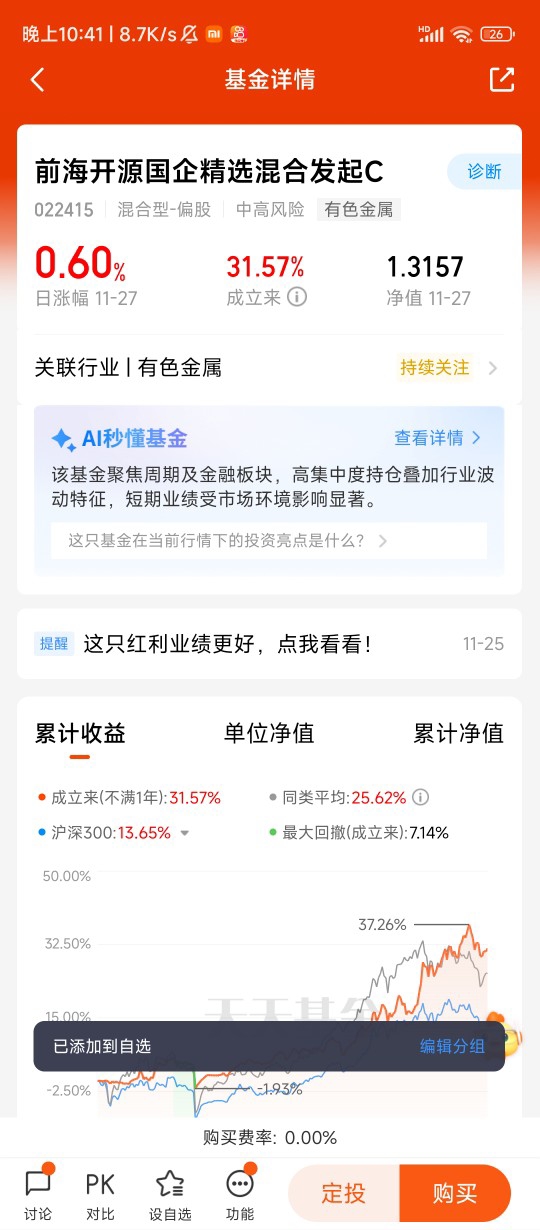但单独布局哪一类都有短板:A股红利行业偏传统,成长属性稍弱;港股红利不仅要面对20%-28%的固定红利税,还受国际资本流动、汇率波动影响,波动率更高 。而前海开源国企精选混合发起C的聪明之处,就在于用“精选国企+跨市场布局”破解了单一红利资产的局限。这只基金精准聚焦优质央国企赛道,既重仓了紫金矿业、洛阳钼业等A股传统高分红龙头,又通过港股通纳入中银香港等港股国企标的,持股集中度超72%,实现了A港红利的优势互补 。