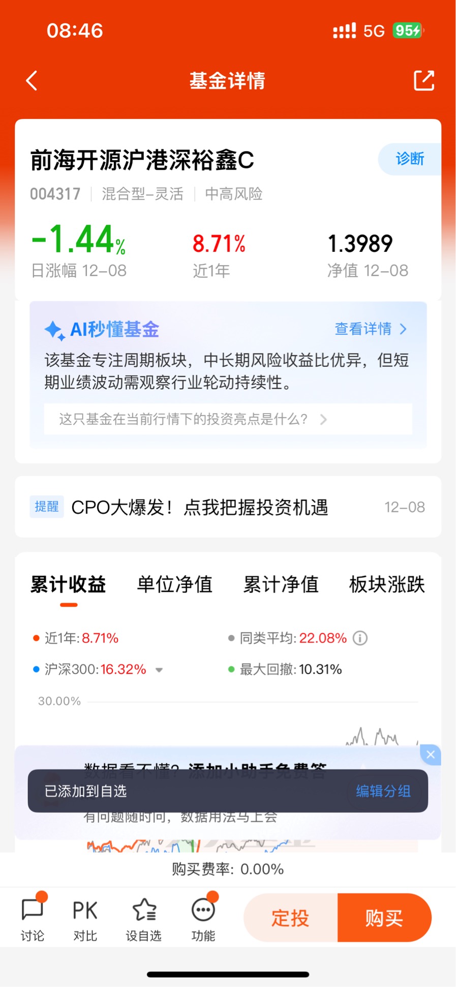 从业绩表现来看,基金自2024年12月成立以来表现亮眼,截至2025年12月8日,单位净值达1.3636,近6个月涨幅30.66%,近12个月涨幅更是高达36.36%,在震荡市中展现出较强的盈利能力。这样的业绩背后,离不开基金经理田维的专业运作,其依托前海开源基金的投研体系,通过大类资产配置与个股精选相结合的策略,在92.58%的股票资产持仓中精准筛选优质标的,同时保留一定现金仓位应对市场波动,实现了风险与收益的优化平衡。